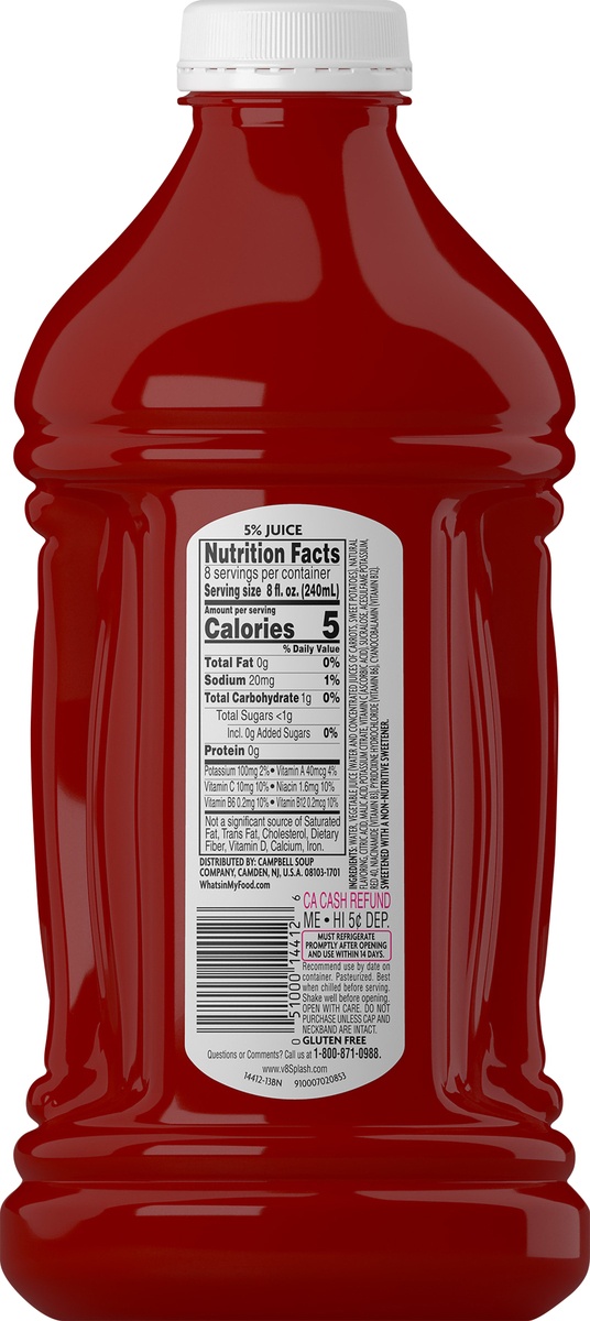 CAMPBELL Soup Company, V8 SPLASH Juice Drinks, Diet Strawberry ... - Self It is also a very good source of Vitamin A, Vitamin C and Vitamin E (Alpha Tocopherol). The bad: A large portion of the calories in this food come from sugars. Caloric Ratio Pyramid Caloric Ratio...