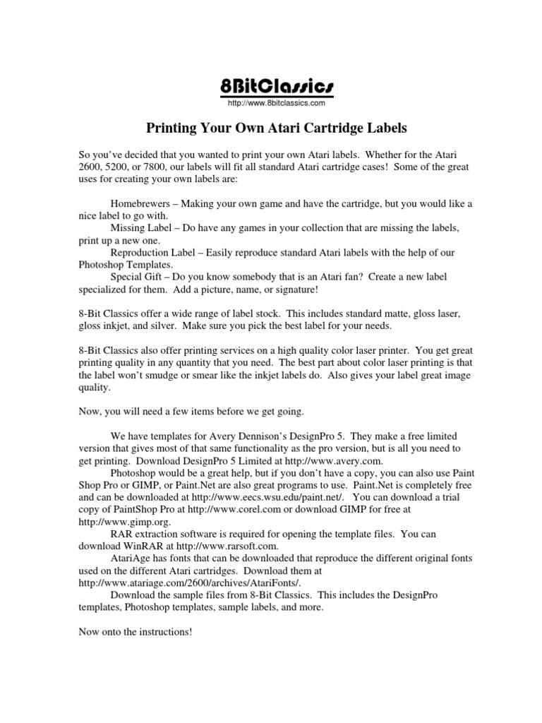 Make Custom Atari 2600 Cartridges (30-60 mins) Step 1 - Make your label graphics Instructions are included on the Atari Age website for the dimensions of the label graphics. You can do this yourself with an appropriate graphic design software package. The easiest approach is to use the online Atari 2600 label maker. They provide templates for you to add your text and label art.