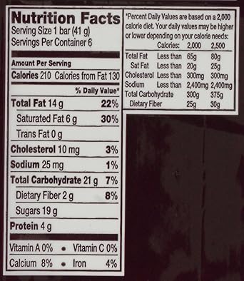 Hershey's Oat Made Chocolate Bars Reviews & Info (Dairy-Free) Ingredients: sugar, cocoa butter (rainforest alliance certified), chocolate (rainforest alliance certified), almonds, oat flour, rice flour, lecithin (soy), sunflower oil, sea salt, natural flavor. contains: almonds, soy. Nutrition (per 1.55-ounce bar): 230 calories, 16g fat, 24g carbs, 2g fiber, 16g sugars (includes 16g added sugars), 3g protein.*