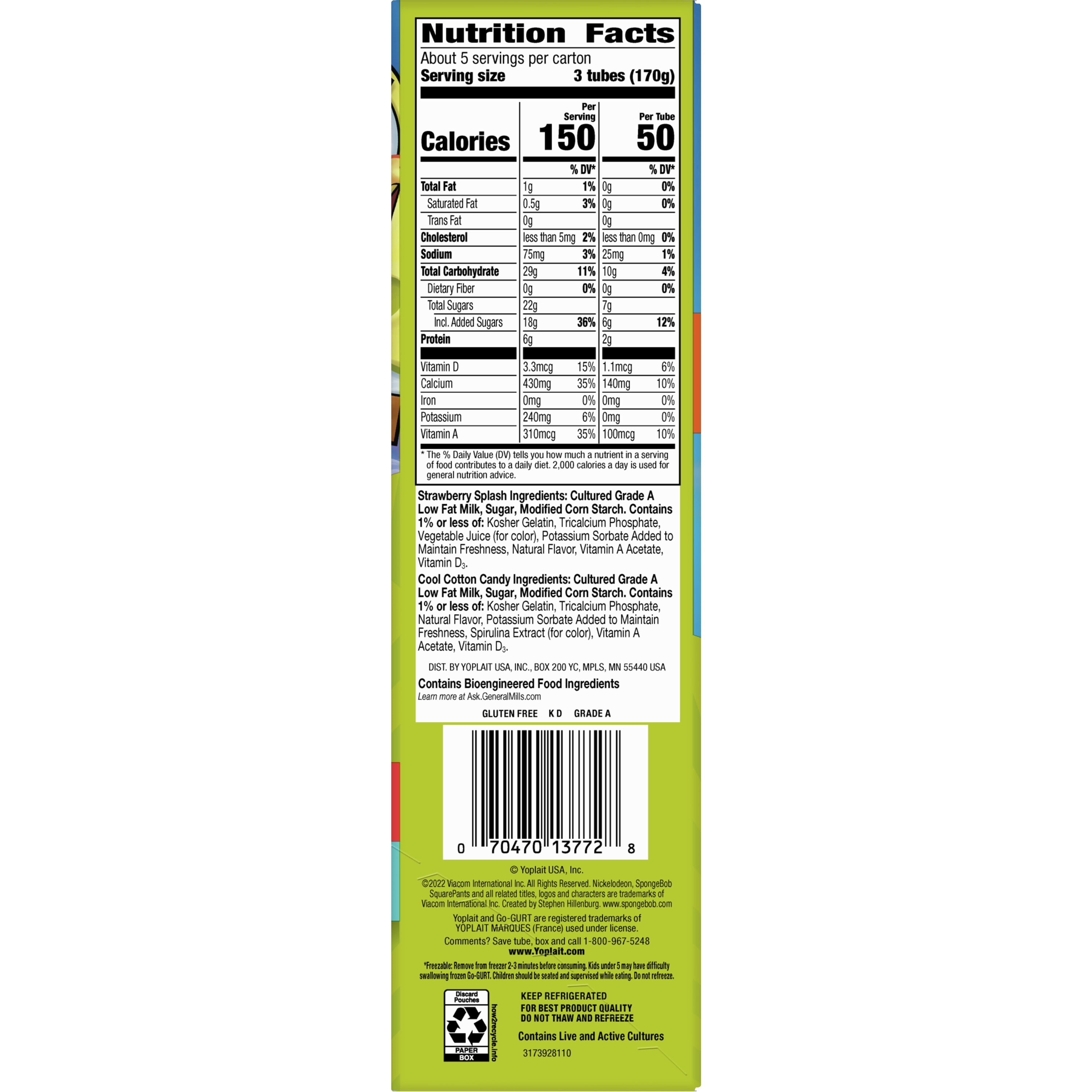 Yoplait Go-Gurt, Low Fat Yogurt, Relaxin' Raspberry & Slothberry Banana ... Nutrition facts. Refer to the product label for full dietary information, which may be available as an alternative product image. 16 Servings Per Container. ... The yummy flavors of creamy raspberry and strawberry banana go where you go with Yoplait Go Gurt Kids Yogurt Tubes. The easy-to-open yogurt tubes make it more convenient than ever ...