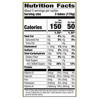 Gogurt Nutrition Facts, Ingredients, Health Benefits - TipsFu Gogurt Nutrition Facts Nutrition Facts servings per container Serving size 3.00 tubes (170g) Amount per serving Calories 150 % Daily Value* Total Fat 1g 2% Saturated Fat 0.5g 3% Trans Fat 0g Cholesterol 5mg 2% Sodium 75mg 4% Total Carbohydrate 29g 10% Dietary Fiber 0g 0% Total Sugars 22g Includes 18g Added Sugars 36% Protein 6g Vitamin D 3.3mcg 17%