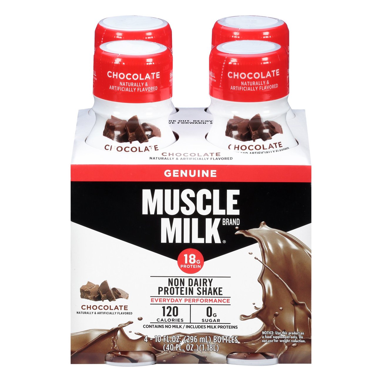 Muscle Milk Genuine Chocolate Non-Dairy Protein Shakes Muscle Milk Genuine Chocolate Non-Dairy Protein Shakes 11 oz, 4 pk $7.19 ($0.17/oz) Icon details Product description - Convenient 4 pack, 11 fl. oz. bottles - Great for an everyday snack, protein boost, or post-workout recovery - 160 calories, 25g protein, 0g sugar, 4g fiber per serving - Smooth and creamy chocolate flavor
