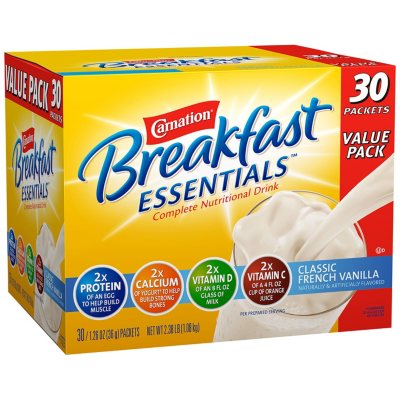 Carnation Instant Breakfast: Pros, Cons, and Expert Advice Depending on the flavor or variety, each Carnation Breakfast Essentials product has slightly different nutritional information. But all contains 20% or more of daily protein needs, plus 21 vitamins and minerals, including vitamin D, calcium, iron, zinc, and vitamin B12. Pros and Cons
