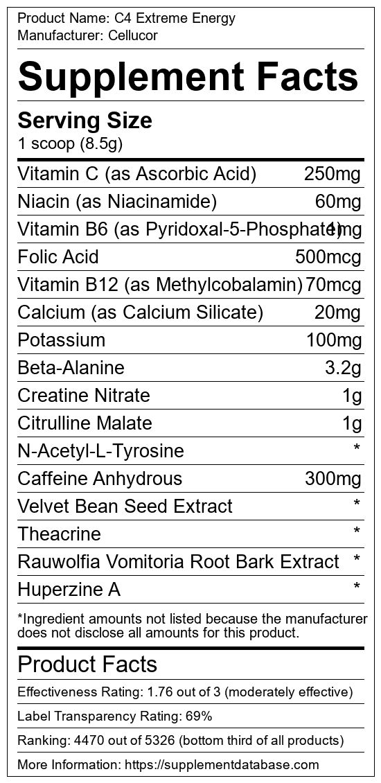 C4 extreme nutrition label. Everything you need to know about C4! - Cellucor Help This product boasts a fully transparent label, made without artificial flavors or dyes, and contains an innovative formula with 25% more energy (200mg caffeine) and endurance than C4 Original, plus 2x the nitrates, to deliver enhanced energy, pumps, focus, and performance. C4 Ultimate: C4 Ultimate is the most powerful, all-inclusive C4 EVER. C4 Extreme Pre Workout Powder Icy Blue Razz | Preworkout Energy ... C4 Extreme Pre Workout Powder Icy Blue Razz | Preworkout Energy Supplement for Men & Women | 200mg Caffeine + Beta Alanine + Creatine | 60 Servings Visit the Cellucor Store 3,446 ratings | 7 answered questions Amazon's Choice in Sports Nutrition Pre-Workout Powders by Cellucor Price: $54.99 ($4.06 / Ounce) Size: 60 Servings (Pack of 1) C4 Energy Drink Nutrition Facts (Analysis) - REIZECLUB Each 16 fl.oz can of C4 Original Carbonated drink contains the following ingredients: 0 calories 0g total carbohydrates 0g total sugar 30mg niacin (as niacinamide) 6mcg vitamin B12 (as Methylcobalamin) 85mg potassium The beverage is made of 6.73g of Explosive Performance Energy Blend that contains: Caffeine anhydrous (200mg) CarnoSyn Beta-alanine C4 Extreme - FACTORY DIRECT NUTRITION Description In 2011, the Original C4® Extreme came to define the pre-workout category. Building on that heritage and legacy, the new C4® Extreme has been re-engineered and re-imagined from the ground up to help support explosive energy, extreme performance, and mental alertness.* As part of Project Clear Evolution, C4®