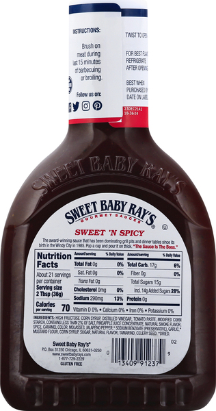 Barbecue sauce, barbecue by Sweet Baby Rays Inc. nutrition facts and ... 51529. 7. Barbecue sauce, barbecue by Sweet Baby Rays Inc. contains 70 calories per 36 g serving. This serving contains 0 g of fat, 0 g of protein and 18 g of carbohydrate. The latter is 17 g sugar and 0 g of dietary fiber, the rest is complex carbohydrate. Barbecue sauce, barbecue by Sweet Baby Rays Inc. contains 0 g of saturated fat and 0 mg ... Sweet Baby Ray's Barbecue Sauce Allergy and Ingredient Information Nutrition Facts Serving Size 2.00 tbsp Amount Per Serving Calories 70 Calories from Fat 0 % Daily Value* Total Fat 0g 0% Sodium 0.29g 12.08% Total Carbohydrates 17g 5.66% Sugars 16g Protein 0g Vitamin A 0% Vitamin C 6% Calcium 0% Iron 0% *Percentage Daily Values are based on a 2,000 calorie diet. Sweet Baby Ray's Barbecue Sauce, Original - Fooducate Sweet Baby Ray's Barbecue Sauce, Original nutrition grade D 70 Calories Per Serving 27 comments Rating: 4.24 with 218 ratings 3 followers Explanations Keto: net carbs 18g If you are following a ketogenic diet (keto), you need to restrict your daily carbohydrate intake so that your body enters ketosis. Sweet Baby Ray's Honey Barbecue Sauce - H-E-B Ingredients High Fructose Corn Syrup, Distilled Vinegar, Tomato Paste, Honey, Modified Corn Starch, Salt, Contains Less Than 2% Of Caramel Color, Natural Flavor, Pineapple Juice Concentrate, Spice, Sodium Benzoate (Preservative), Natural Smoke Flavor, Molasses, Garlic* Corn Syrup, Sugar, Mustard Flour, Tamarind, Celery Seed. *Dried.