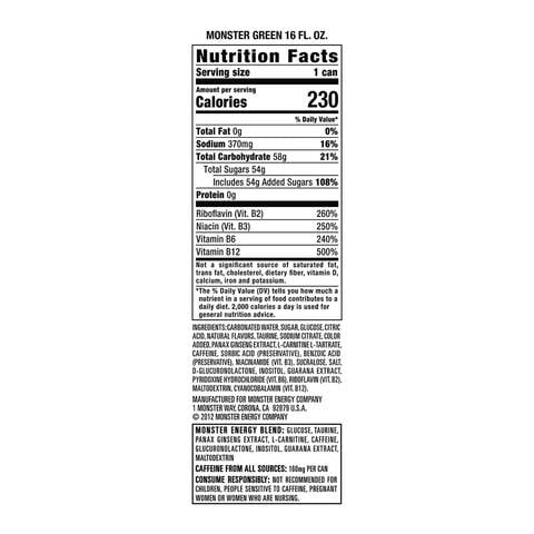 Monster nutritional information. Monster Nutrition Facts - Eat This Much Calories, carbs, fat, protein, fiber, cholesterol, and more for Monster (Energy drink). Want to use it in a meal plan? Head to the diet generator and enter the number of calories you want. Monster Energy Nutrition Facts (At Close Range) Each 16 fl. oz. can of Monster Energy Drink contains 160 mg caffeine, 210 calories, 54 grams of sugar, and a variety of other energy-boosting ingredients.. Monster is also packed with vitamins and nutrients, all of which are essential for the body to function better. In this article, we'll have a closer look at the nutrition facts of Monster to help you arrive at an informed decision whether ... Ultra | Monster Ultra Zero-Sugar Energy Drinks - Monster Energy Our team riders and Monster Girls are no different… they've been dropping some hints lately. They've been asking us for a new Monster drink. A little less sweet, lighter-tasting, zero calories, but with a full load of our Monster energy blend. Sure, white is the new black. We went all out: Monster Energy Ultra. Monster Energy Nutrition Fact (Details Revealed) Monster energy drink is one of the best energy drinks available right after Red Bull.It was founded by Hansen Natural company and is famous around the globe. Millions of people consume this energy drink daily to quickly go through their hectic daily schedules. In short, a can of Monster energy drink contains 54 g of sugar, 210 calories, and 160 mg of caffeine in its formula.