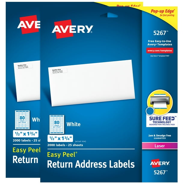 Avery® 5267 Easy Peel 1/2" x 1 3/4" Printable Return Address ... Avery 5267. Details Standardize your letters and packages with the Avery® 5267 1/2" x 1 3/4" white return address labels. Each label can be customized with your return address using a laser printer, making it easy to mail out bulk letters, bills, or promotions. AVERY 5267 Easy Peel Return Address Labels, Laser, 1/2 x 1 3/ ... AVERY 5267 Easy Peel Return Address Labels, Laser, 1/2 x 1 3/4, White (Pack of 2000), (Model: 05267) Visit the AVERY Store 2,707 ratings | 18 answered questions -17% $1419 ($0.01 / Count) List Price: $17.11 Get Fast, Free Shipping with Amazon Prime FREE Returns Available at a lower price from other sellers that may not offer free Prime shipping.